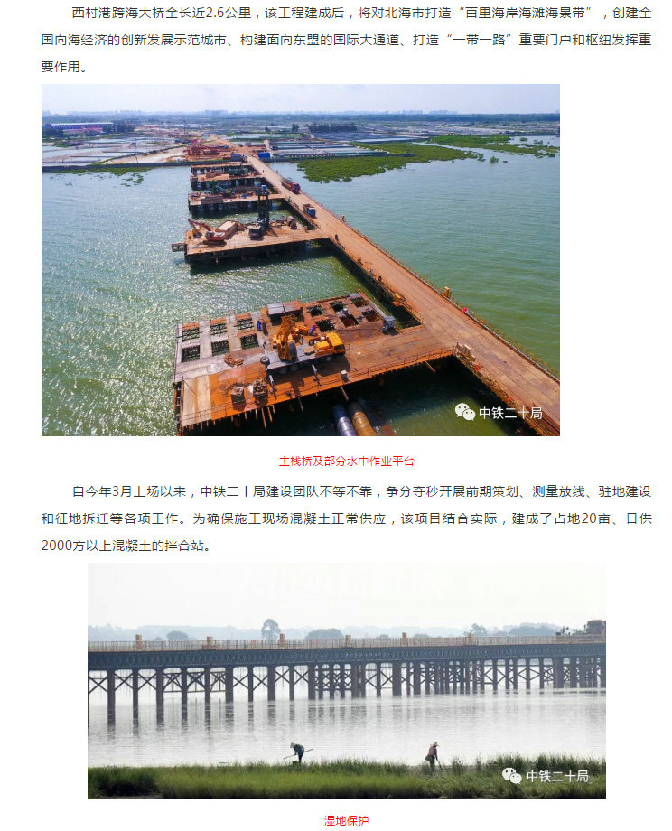 該工程緊鄰北海銀灘東區(qū)海濱濕地公園,棲息著蒼鷺、剪尾、招潮蟹、海桑、鹵蕨等數十種動植物,生態(tài)保護壓力巨大。中鐵二十局建設者在施工中全面推行工地除塵、棧橋降溫、濕地防護等保護措施,精心做好生態(tài)保護工作。